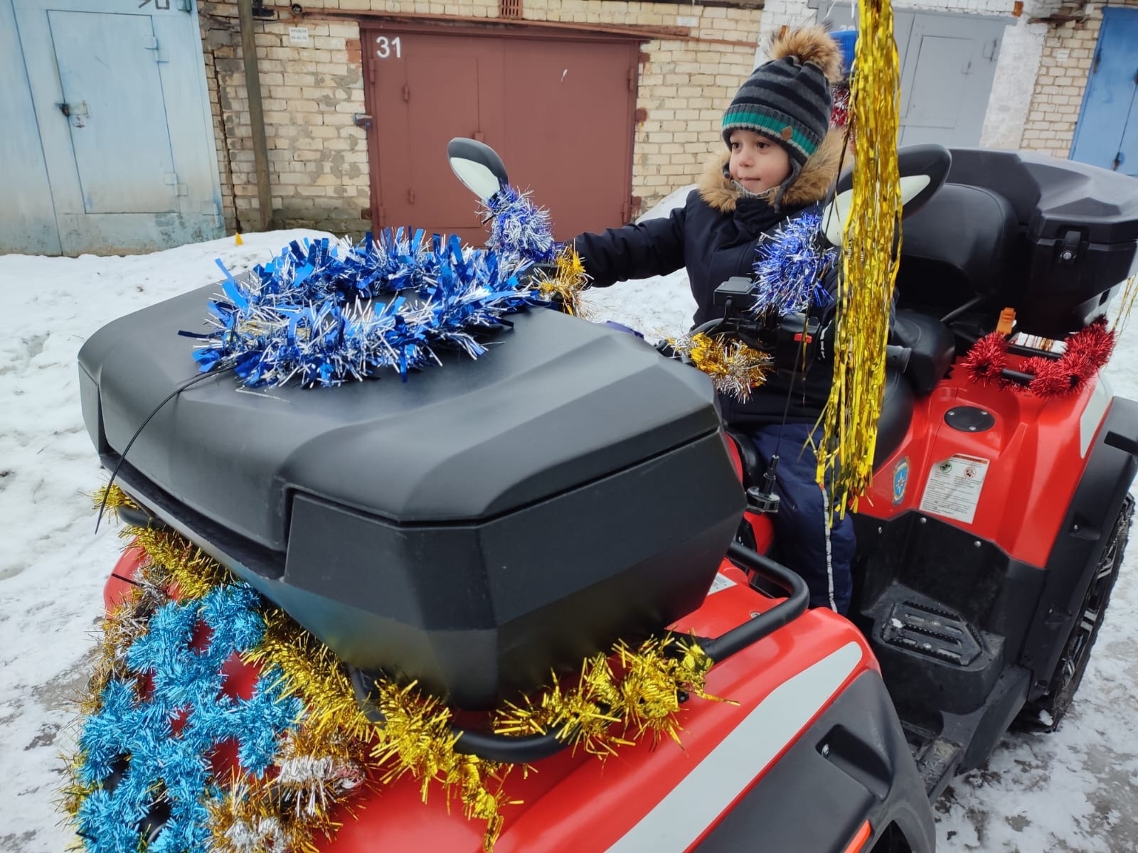 Очень эффектно появился сам дедушка и Снегурочка - наши друзья из спасательных служб привезли их на квадроцикле